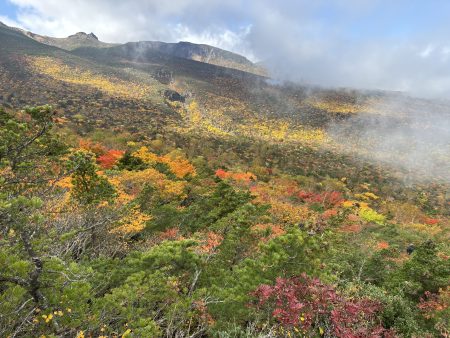 安達太良山は久しぶりにお天気に恵まれて大勢の行楽客で賑わっていました。山腹は絨毯を織りなすような赤黄色、緑色のコントラストが秋景色を彩っています。奥岳からは駐車場やロープウェーが大変混んでいるので平日がお勧めです。2025/10/17